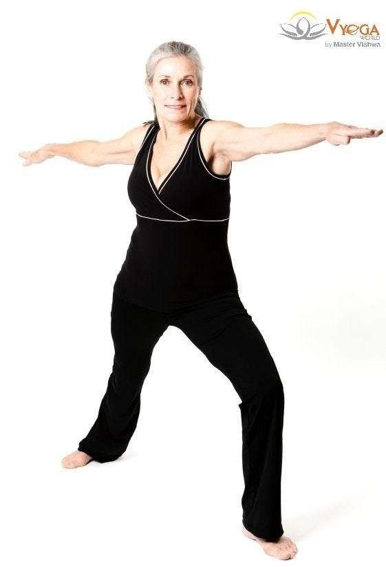 - Đứng thẳng. Thở ra, đưa chân trái lên 90 độ, hơi cong đầu gối để đứng thoải mái, sau đó dịch chân phải sang bên, nâng hai tay lên ngang vai, tay chái thẳng chân trái và tay phải thì thẳng chân phải. Hít vào thở ra và lặp lại động tác với chân kia.