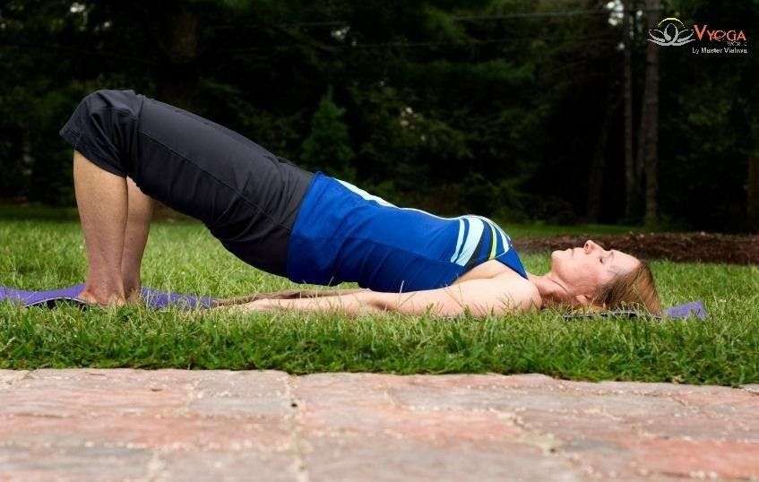 - Nằm thẳng trên thảm, duỗi chân, hai tay duỗi song song người. Nâng hai chân lên, sao cho hai bàn chân vẫn chạm mặt thảm, từ từ hít vào và nâng hông lên sao cho mông không còn chạm mặt thảm. Thở ra và hạ hông xuống thảm.