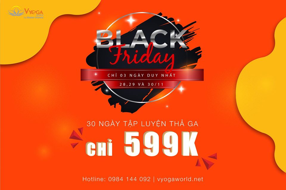 Hòa mình cùng không khí BLACK FRIDAY, trung tâm Vyoga World bùng nổ gói tập khuyến mãi giảm giá chỉ còn 599K cho 1 tháng tập luyện yoga thả ga áp dụng cho tất cả mọi người. Còn chần chờ gì nữa mà không đăng ký ngay với trung tâm Vyoga World để được sở hữu gói tập luyện cùng với các thầy huấn luyện viên yoga chuyên nghiệp đến từ Ấn Độ.