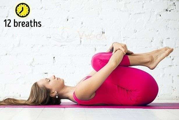 Nằm thẳng lưng trên thảm tập, đầu gối gập tạo góc 45 độ. Nâng cao chân, hai bàn tay ôm lấy đầu gối, ép chặt gối về gần ngực. Hít sâu, nhấc vai, đưa cằm chạm đầu gối. Giữ khoảng 10 - 12 nhịp thở sau đó nhẹ nhàng thả lỏng vai và đầu về tư thế bắt đầu.