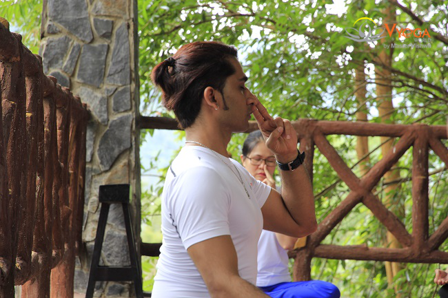 - Ngồi chéo chân thật thoải mái trên hai đùi, đặt ngón tay cái lên hai tai, trong khi đó các ngón còn lại trải dài trên khuôn mặt từ mắt, mũi, môi và cằm.
