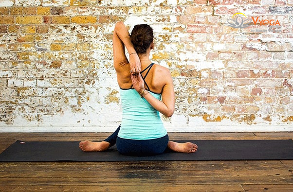- Ngồi bắt chéo chân bình thường, dùng tay trái nắm lấy cổ tay phải vòng ra sau. Hít vào kéo vai ra sau và mở rộng ngực.Giữ cổ tay trái của bạn với bàn tay phải của bạn ở phía sau