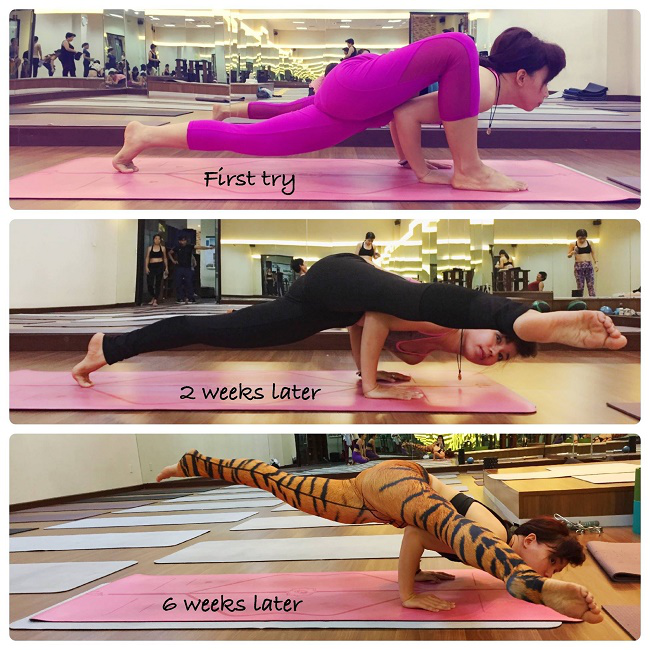Tư thế đầu tiên tôi chinh phục được sau 3 tháng tập yoga chính là chaturanga. Chaturanga không phải là động tác quá khó hay cần độ dẻo, nhưng để làm được động tác này hoàn hảo đối với một người trước đó chưa từng chơi môn thể thao hay vận động nào như tôi cũng không phải đơn giản. Ê ẩm cả người nhưng tôi cười sung sướng. Sau đó lần lượt đến các động tác nâng cao khác nhau: con quạ, trồng chuối, thằn lằn bay, bồ câu, bọ cạp…