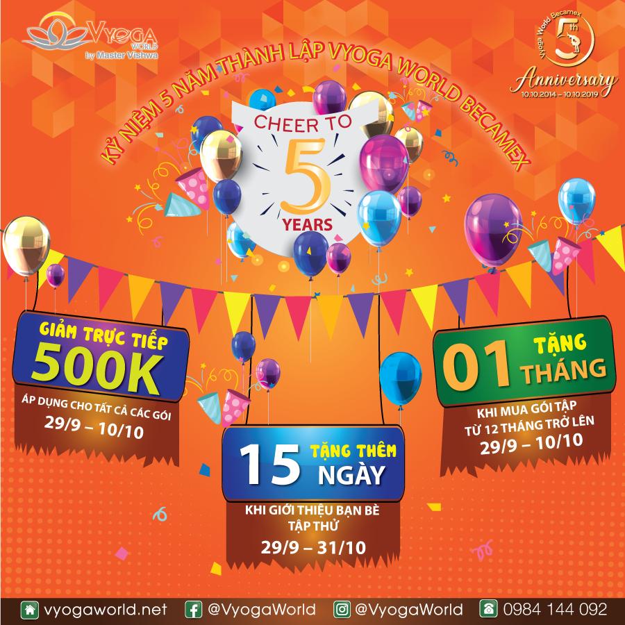Mong muốn tri ân quý khách hàng đã tin tưởng và lựa chọn trung tâm Vyoga World trong thời gian qua, từ ngày 01/10, Hệ thống Vyoga World diễn ra chương trình “CHEER TO 5 YEARS” với rất nhiều lợi ích thiết thực cho khách hàng.