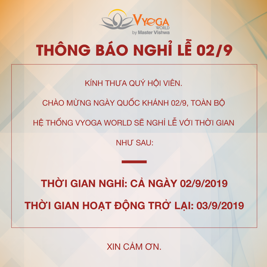 – Thời gian nghỉ lễ: Vyoga World bắt đầu nghỉ lễ Quốc Khánh từ ngày 02/09/2019.