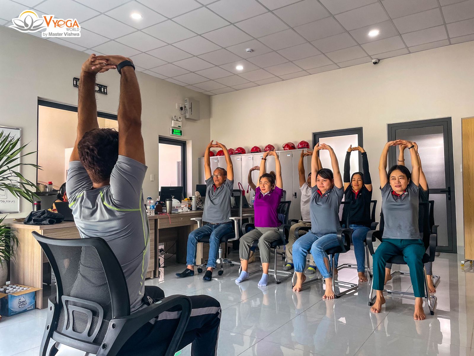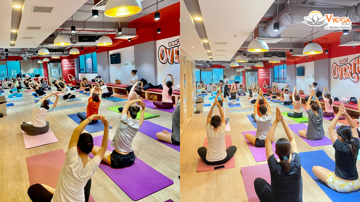 Một lớp học Yoga chuyên sâu dành riêng cho nhân viên ngay tại trung tâm của Vyoga World với đầy đủ tiện ích như: phòng tập, thảm, phòng tắm, nước uống….